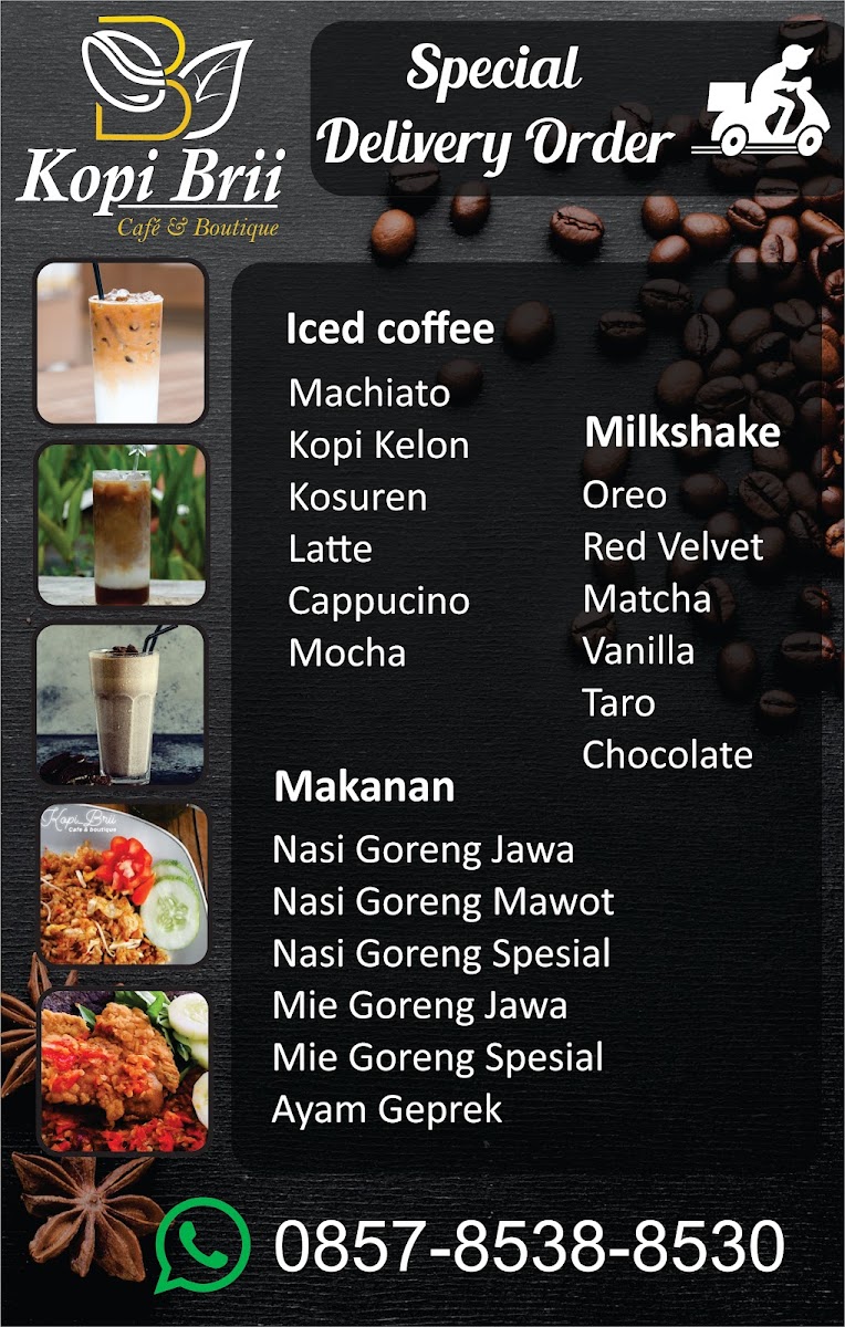 Kopi_Brii menyajikan Original Coffee dengan karakter Kopi Asli Wonosalam. Berawal dari kopi dijadikan banyak farian menu minuman yang terbuat dari kopi seperti Es Kopi Kekinian. Selain kopi, banyak juga menu makanan dengan menu tradisional.